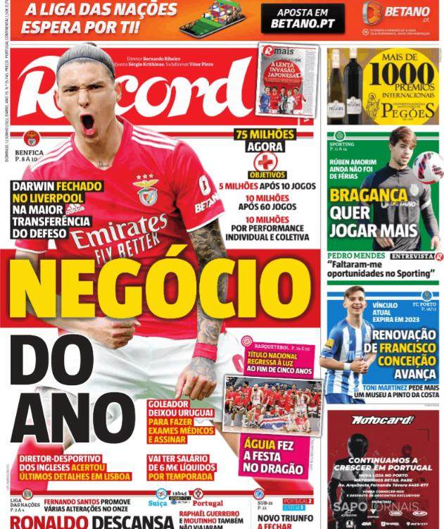 6月12日一期的葡萄牙《球报》和《纪录报》,达尔文·努涅斯转会利物浦一事都上了封面。两家报纸都说,这桩转会已经于6月11日谈妥。